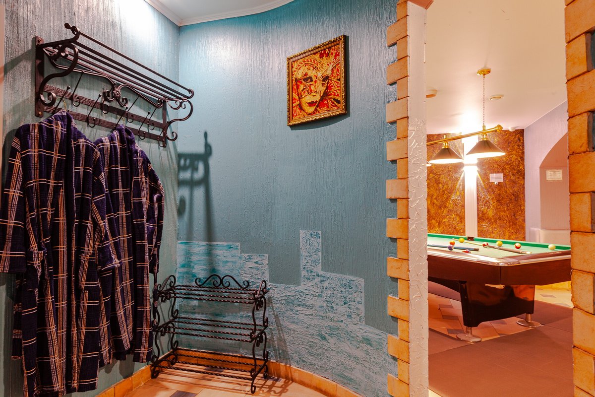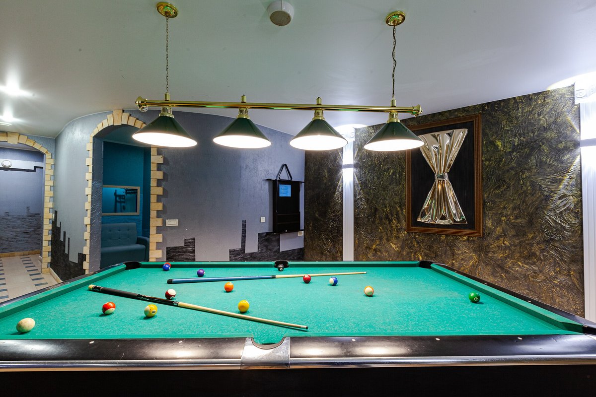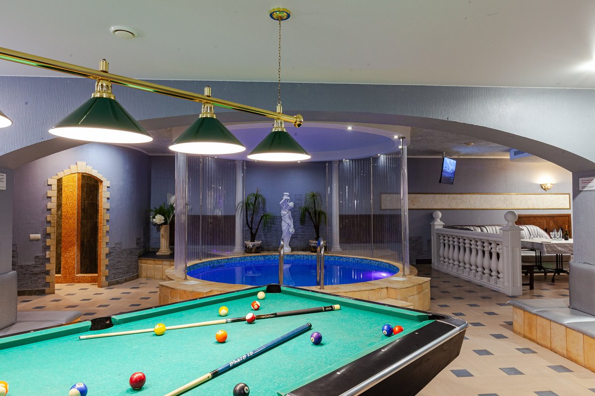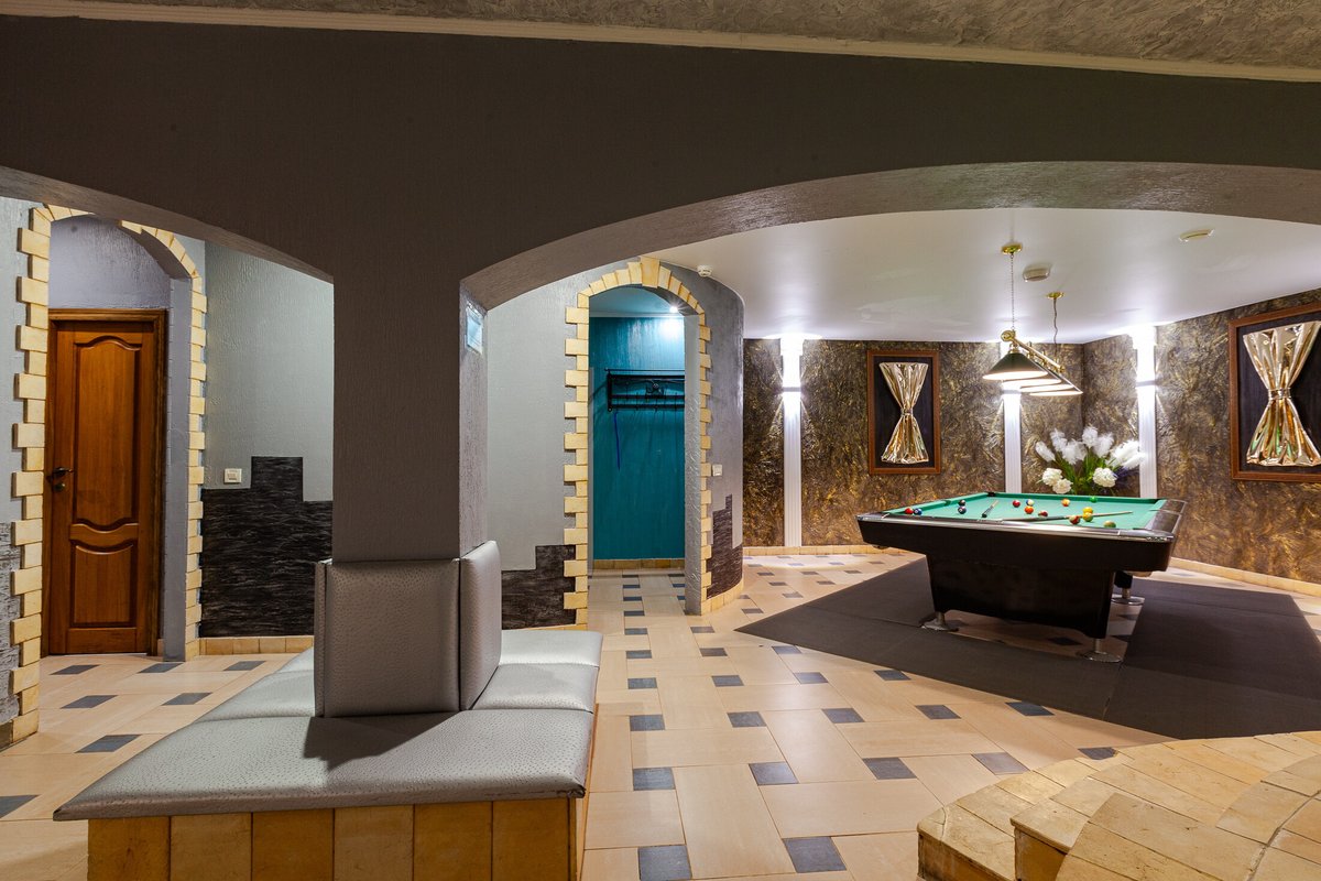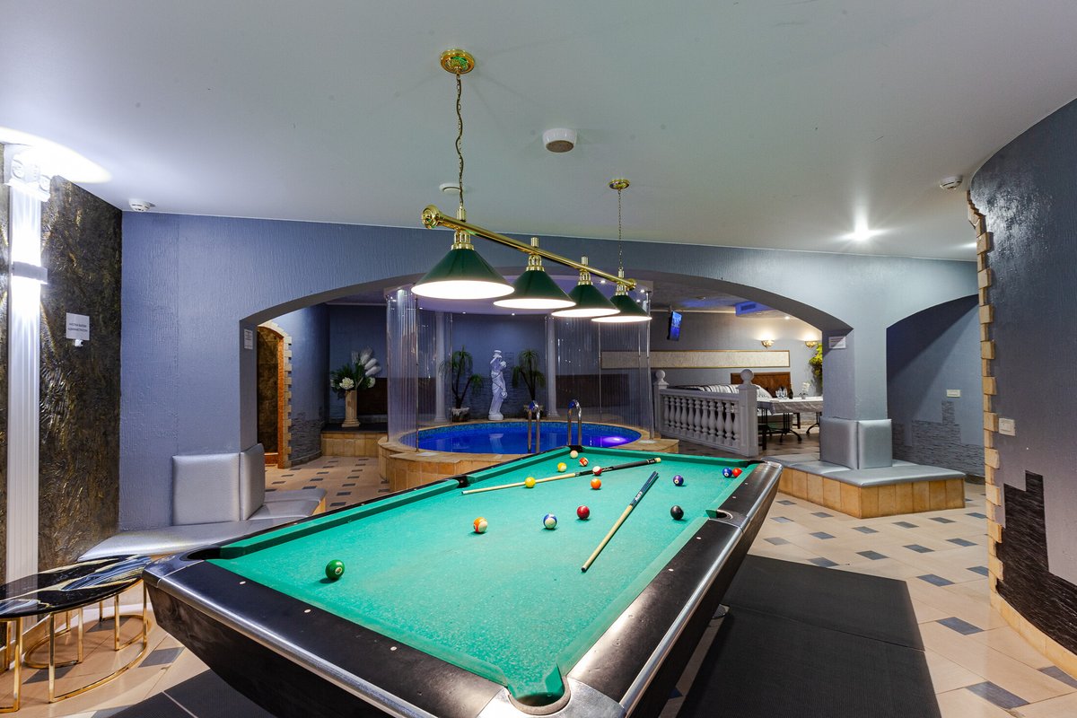 Не хочется в бассейн? Не проблема! Вместо этого можно передохнуть в нашей комнате отдыха. Мы постарались создать здесь комфортный, стильный интерьер из максимально натуральных, экологичных материалов, выбрать мебель, которая будет одновременно удобной и эстетичной. Надеемся, что вам понравится! Для создания настроения у нас есть бильярд, камин и караоке. Также у нас работает бар, где вы можете заказать блюда русской кухни, а если нужно, принести и собственную еду - мы не против! Только не забывайте, что плотная трапеза непосредственно перед посещением парной - это не самая хорошая идея, согласно мнению врачей. А вот после парной можно трапезничать смело!