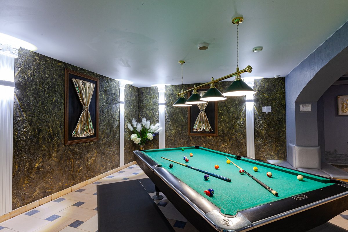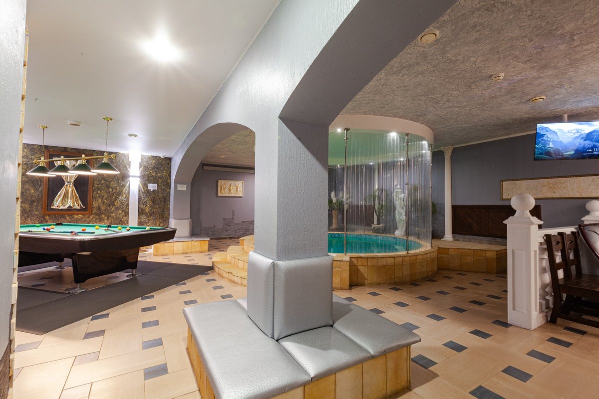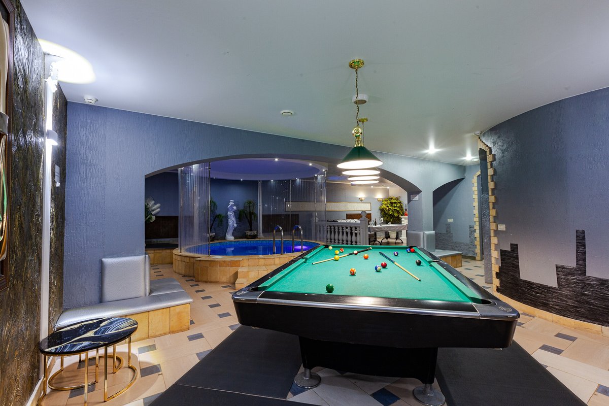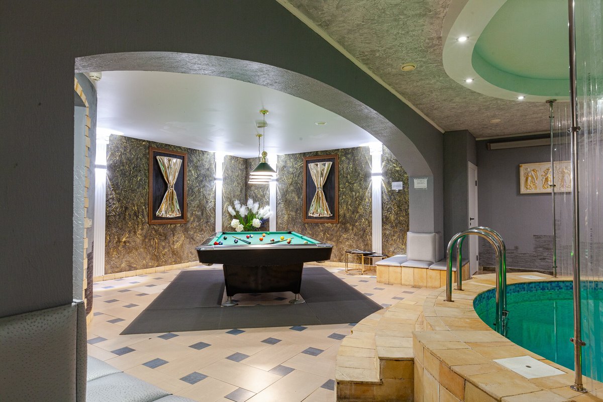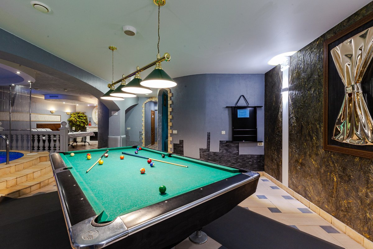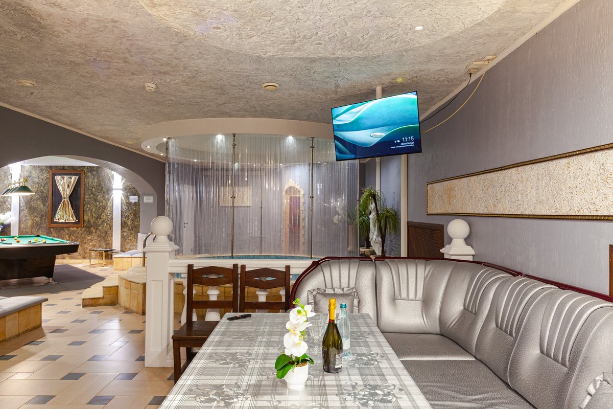 Не хочется в бассейн? Не проблема! Вместо этого можно передохнуть в нашей комнате отдыха. Мы постарались создать здесь комфортный, стильный интерьер из максимально натуральных, экологичных материалов, выбрать мебель, которая будет одновременно удобной и эстетичной. Надеемся, что вам понравится! Для создания настроения у нас есть бильярд, камин и караоке. Также у нас работает бар, где вы можете заказать блюда русской кухни, а если нужно, принести и собственную еду - мы не против! Только не забывайте, что плотная трапеза непосредственно перед посещением парной - это не самая хорошая идея, согласно мнению врачей. А вот после парной можно трапезничать смело!