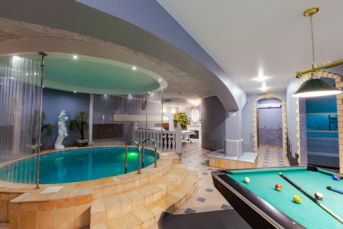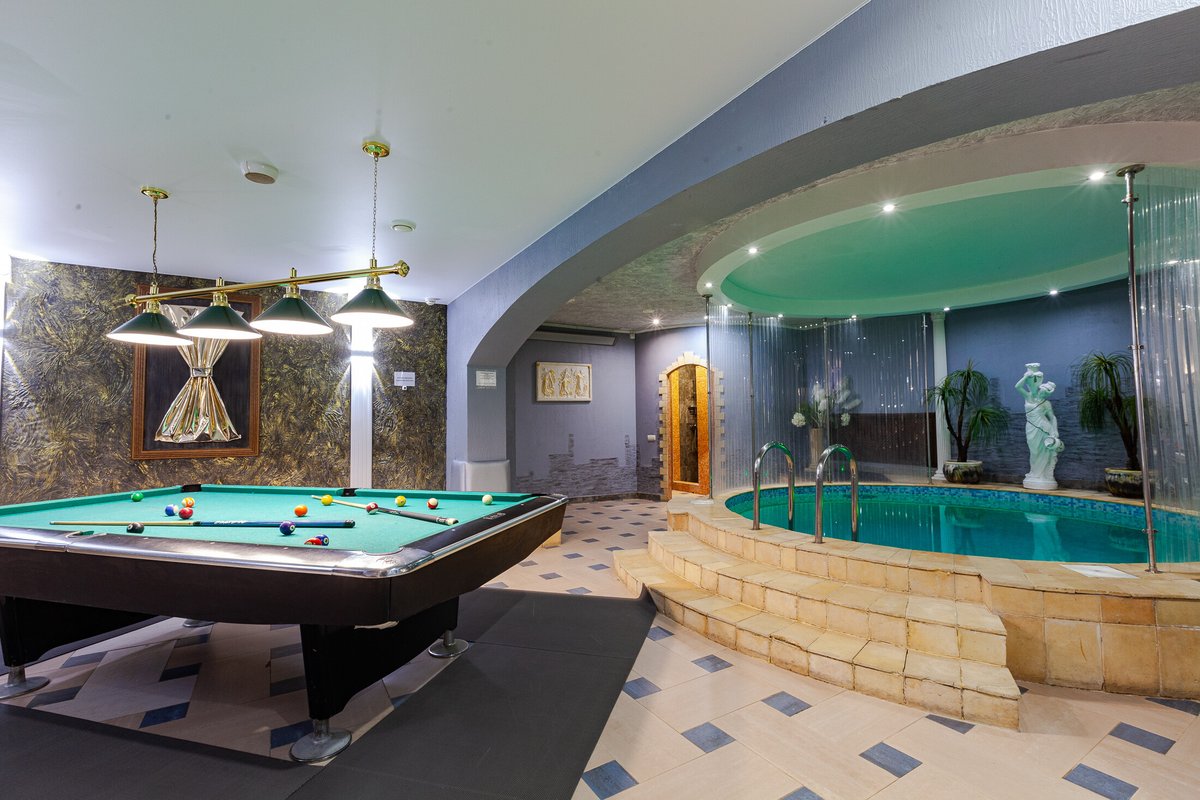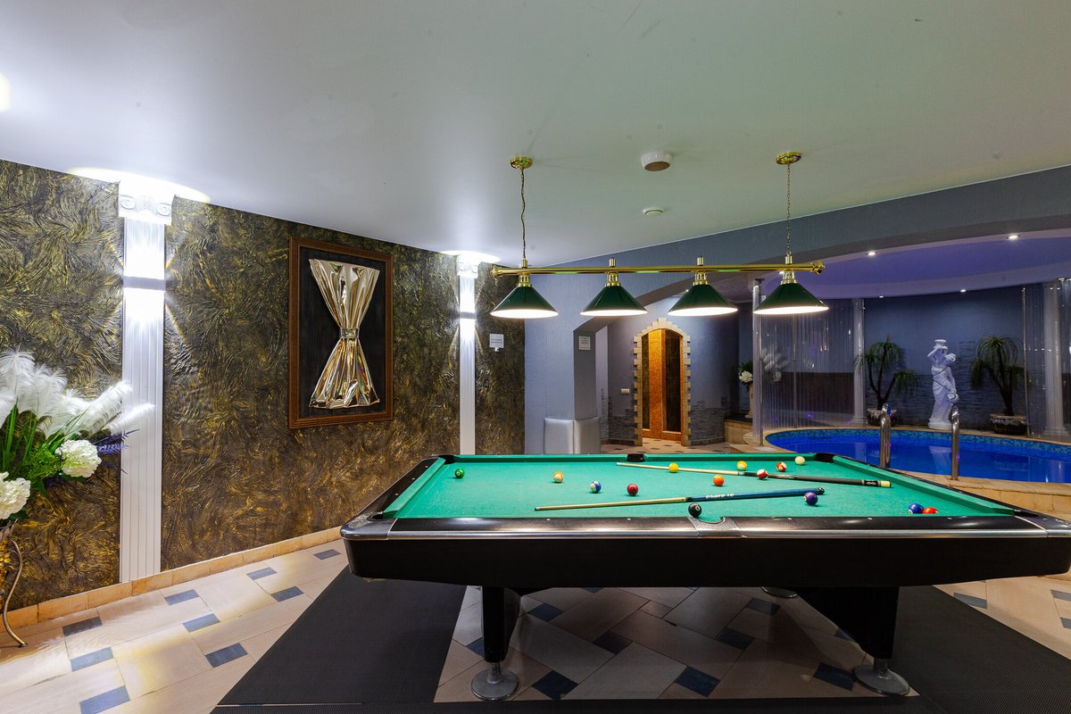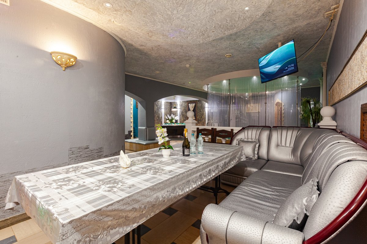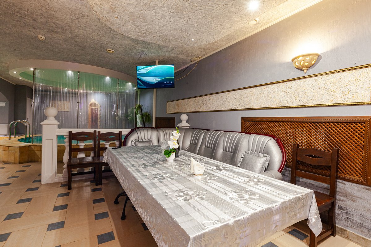 Не хочется в бассейн? Не проблема! Вместо этого можно передохнуть в нашей комнате отдыха. Мы постарались создать здесь комфортный, стильный интерьер из максимально натуральных, экологичных материалов, выбрать мебель, которая будет одновременно удобной и эстетичной. Надеемся, что вам понравится! Для создания настроения у нас есть бильярд, камин и караоке. Также у нас работает бар, где вы можете заказать блюда русской кухни, а если нужно, принести и собственную еду - мы не против! Только не забывайте, что плотная трапеза непосредственно перед посещением парной - это не самая хорошая идея, согласно мнению врачей. А вот после парной можно трапезничать смело!